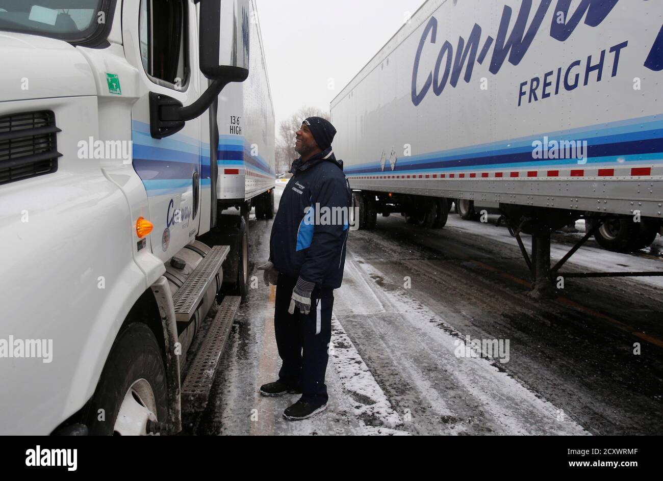 Freight Driver Antoine Seegars Looks Up To Talk With A Fellow Driver At The Con Way Freight Trucking Yard In Romulus Michigan November 19 2014 Manufacturers And Their Suppliers Are Scrambling To Avoid